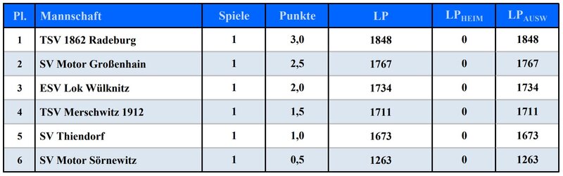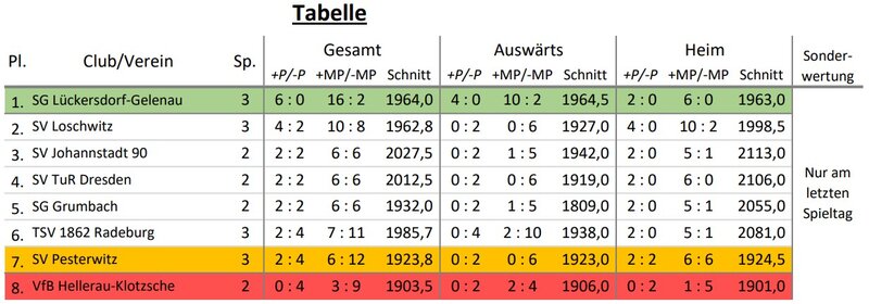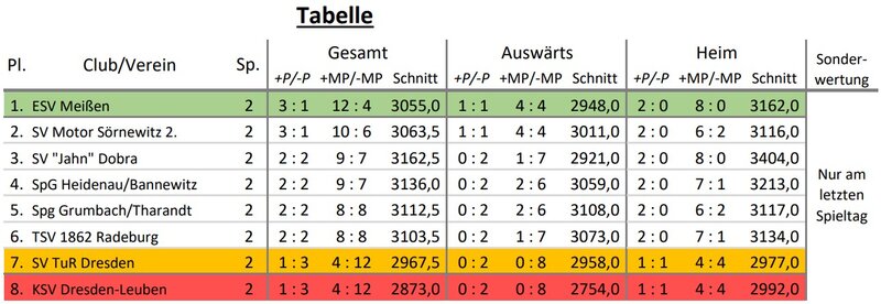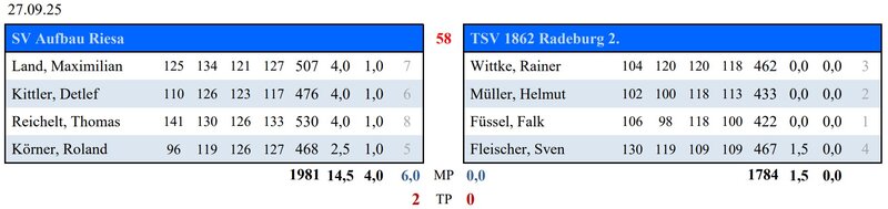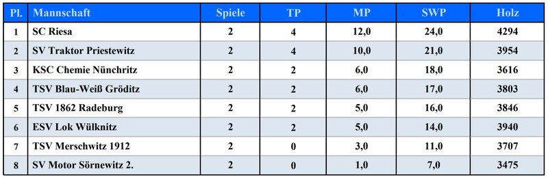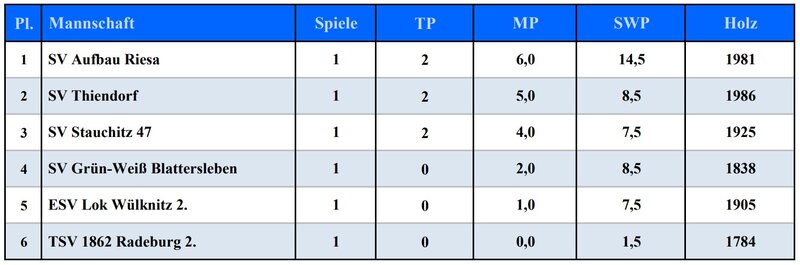 Am 27.09.25 ging es für unsere 2. Männer auswärts gegen den SV Aufbau Riesa los. Leider mussten sie sich dort mit 1981 zu 1784 Holz und 6 zu 0 Mannschaftspunkten geschlagen geben!