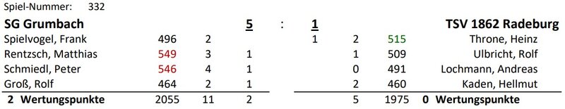 Am 20.09.25 starteten unsere Senioren auswärts gegen den SG Grumbach. Leider verloren sie diesen mit 2055 : 1975 Holz und 5 : 1 Mannschaftspunkten.