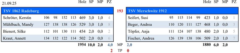Am 21.09.25 ging es für unsere Mädels zu Hause gegen den TSV Merschwitz 1912. Unsere Kampfschnecken waren mit 1954 : 1880 Holz und 4 zu 2 Mannschaftspunkten sehr erfolgreich. Glückwunsch Girls!